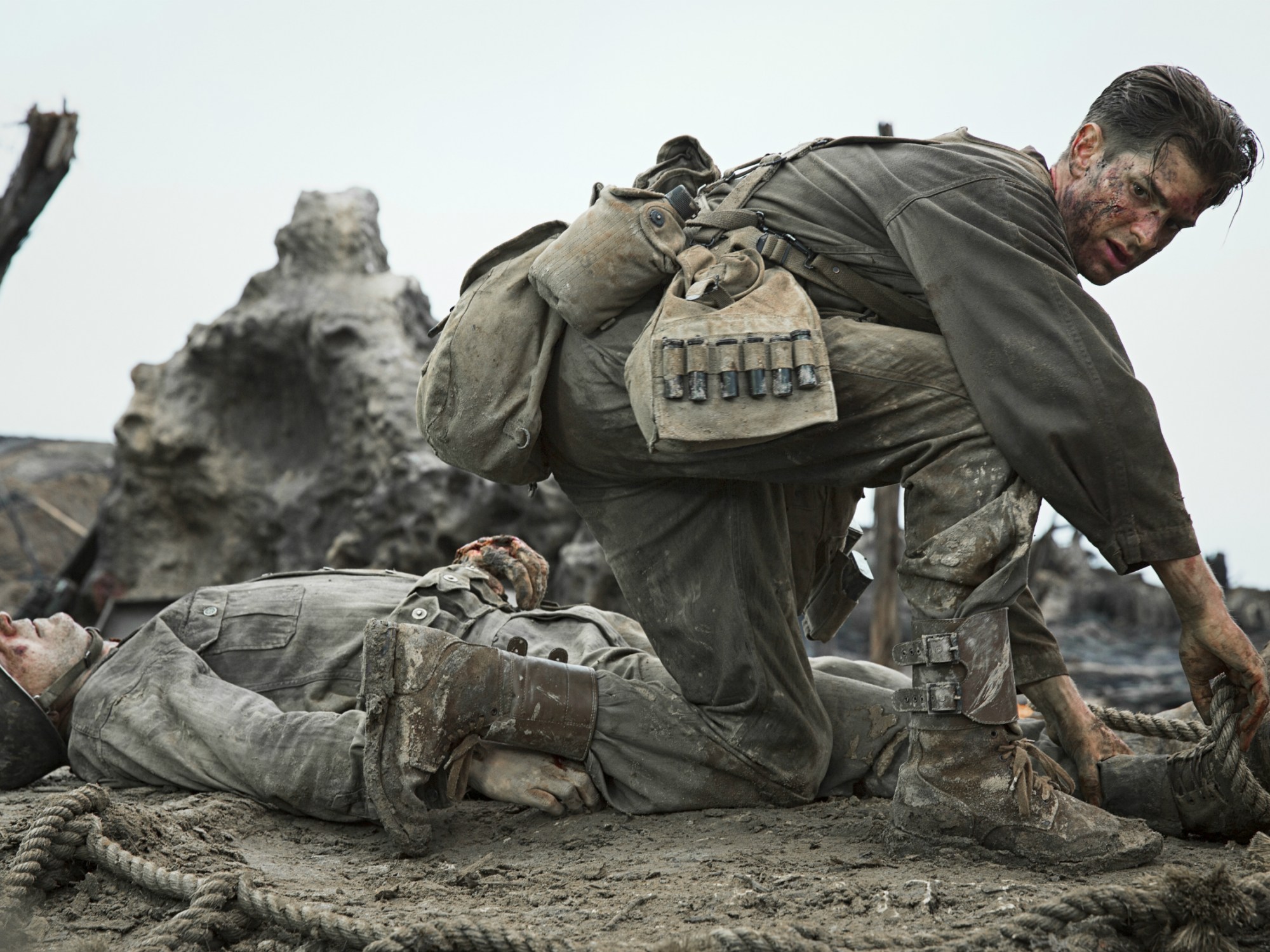 We got Andrew Garfield continuing his own redemption tour from the maligned Amazing Spider-Man films as Private Desmond Doss, a Seventh Day Adventist who willingly enlists in the military during the middle of World War II despite two glaring problems: 1) Doss is VERY devout of his pacifist belief that he cannot even harm another person and 2) the guy won’t even pick up a gun to protect himself. Naturally this is a huge problem for his drill master (Vince Vaughn), his commanding officer (Sam Worthington), and his fellow trainees especially from a fellow named Smitty (played by the Paul Walker knockoff from the terrible Point Break remake). They first belittle Doss, emasculate him, threaten him, and generally treat him like shit to just quit the army…but Doss doesn’t crack. Hell, they just break down the machismo and just try to appeal to Doss’ humanity that his refusal to kill could put several people’s lives at risk. But even upon threat of court marshal, Doss is resolute to serve in the Army as a combat medic without a gun because of very important events that affected his life.